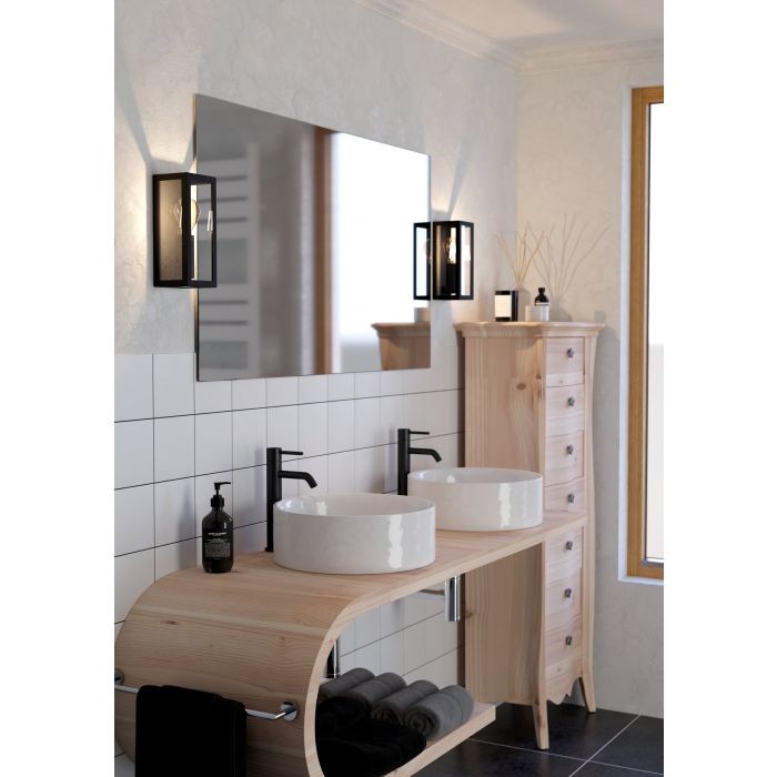 The AMEZOLA wall light (Material number 99123) is designed for indoor use, particularly suitable for bathrooms. It features a black steel enclosure with a clear glass shade, offering a sleek and modern look. The light operates with an E27 socket and supports a maximum wattage of 40W.