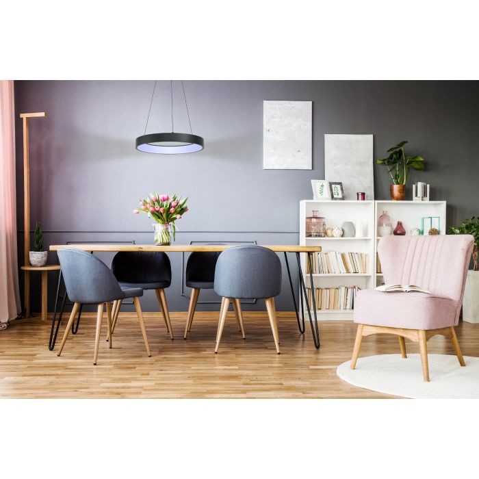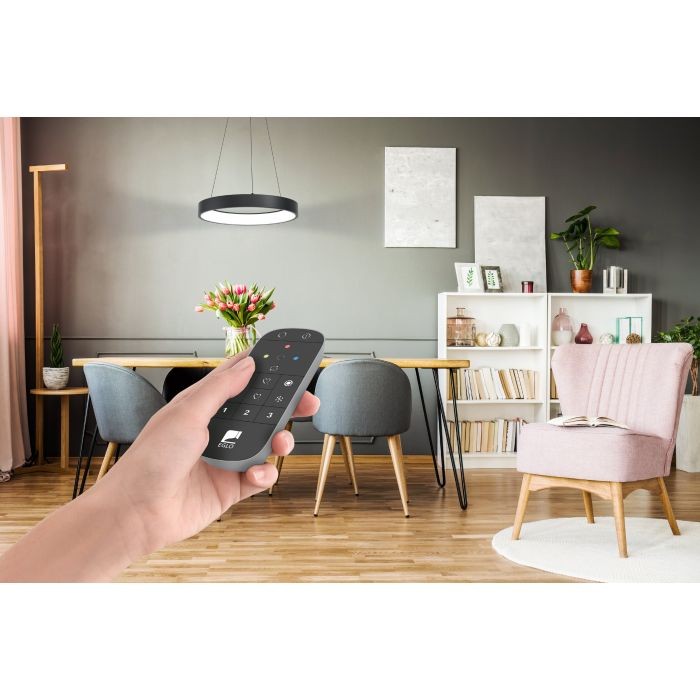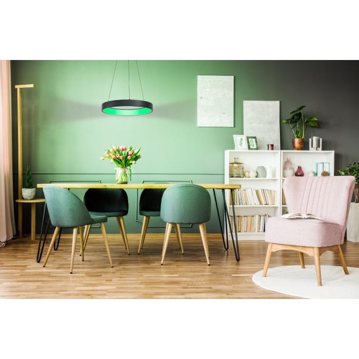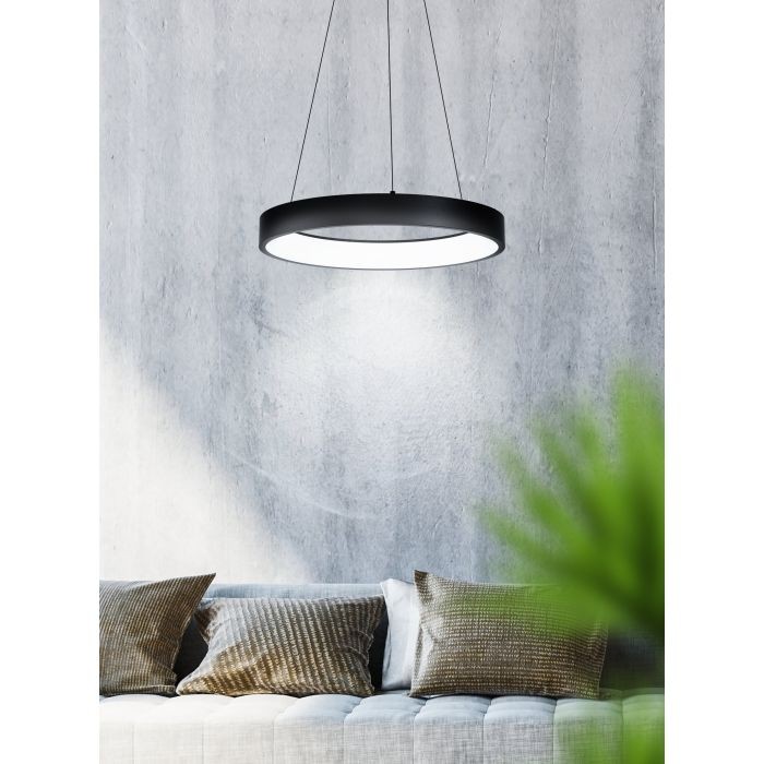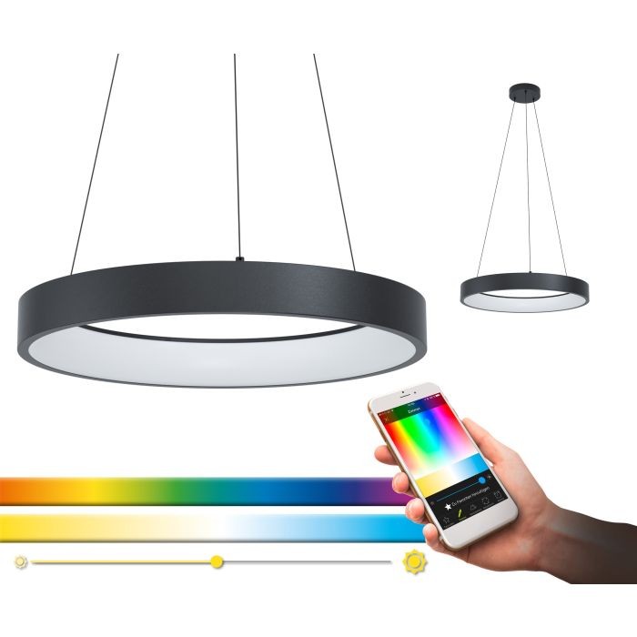 The MARGHERA-C pendant light (Material number 99027) is a versatile indoor fixture from the EGLO connect series. Featuring a steel enclosure in black with a black cable and a white plastic shade, this light is controlled via an app or remote control, offering RGB and tunable white (2700-6500K) lighting options. It provides a bright illumination of 3200 lumens and includes dimming functionality.