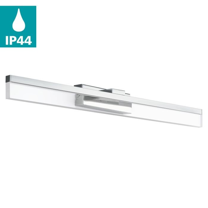The EGLO PALMITAL wall light (model 97966) is an indoor fixture ideal for bathrooms. It features a chrome aluminum and steel enclosure with a clear plastic shade, providing a modern look and durability. The light uses LED technology to emit warm white light at 3000K, delivering a total of 1350 lumens.