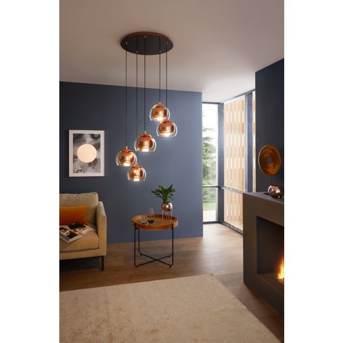 The ROCAMAR 1 pendant light (Material number 98595) is an indoor fixture designed to add elegance to any space. With dimensions measuring 1500mm in height and 585mm in diameter, it features a steel enclosure in a striking copper color, complemented by a black cable and clear glass shade.