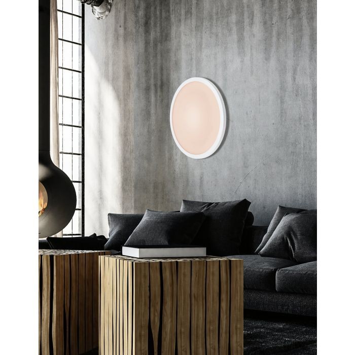 The EGLO SARSINA-C ceiling light (model 97959) is an indoor fixture from the EGLO connect segment. Featuring a white aluminum enclosure and a white plastic shade, it offers remote control and app functionality with BLE, CCT, and RGB capabilities. The light is dimmable and provides a range of color temperatures and RGB lighting.