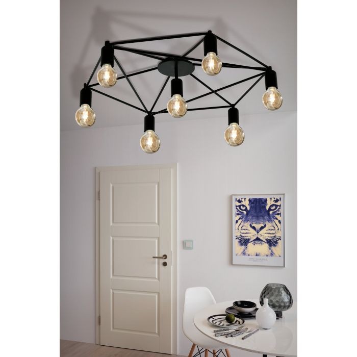 The EGLO STAITI ceiling light (model 97904) is an indoor fixture with a black steel enclosure. It supports up to seven E27 bulbs with a maximum wattage of 60W each.
